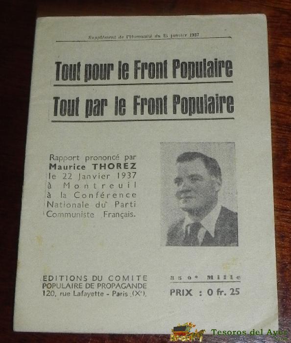 FOLLETO GUERRA CIVIL - 1937 - TOUR POUR LE FRONT POPULAIRE, RAPPORT PRONONCE PAR MAURICE THOREZ EL 22 JANVIER 1937 A MONTREUIL A LA CONFERENCE NATIONALE DU PARTI COMMUNISTE FRANCAIS, 32 PAGINAS, MIDE 17,5 X 13 CMS. ESTE LIBRO ESTABA DENTRO DE UNA COLECCIO