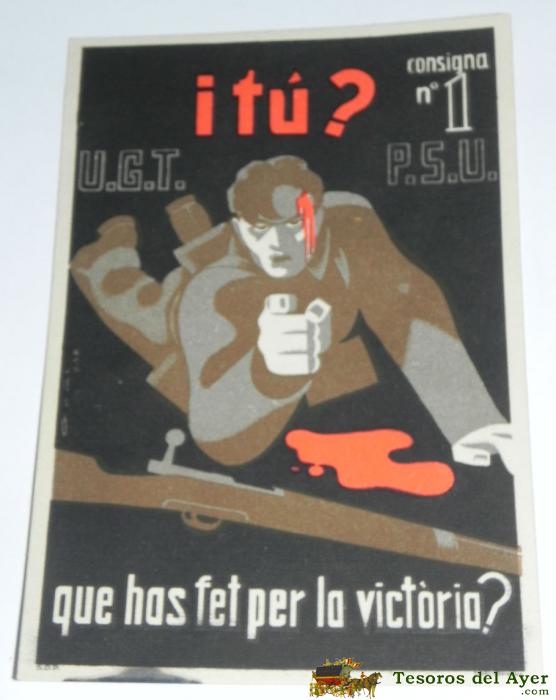 ANTIGUA POSTAL GUERRA CIVIL, P.S.U. - U.G.T. ¡ TU ? CONSIGNA Nº 1, QUE HAS FET PER LA VICTORIA ?, IMP. GRAFOS, P.S.U. - U.G.T. EDICIONS DEL SECRETARIAT D´AGITACIO I PROPAGANDA, 100% ORIGINAL, SIN CIRCULAR, TAL COMO SE VE EN LAS FOTOGRAFIAS PUESTAS.