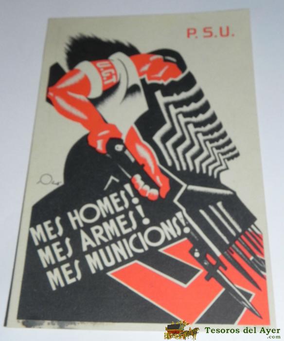 ANTIGUA POSTAL GUERRA CIVIL, P.S.U. - U.G.T. MES HOMES ¡ MES ARMES ¡ MES MUNICIONS ¡ - EDICIONS DEL SECRETARIAT D´AGITACIO I PROPAGANDA, 100% ORIGINAL, SIN CIRCULAR, TAL COMO SE VE EN LAS FOTOGRAFIAS PUESTAS.