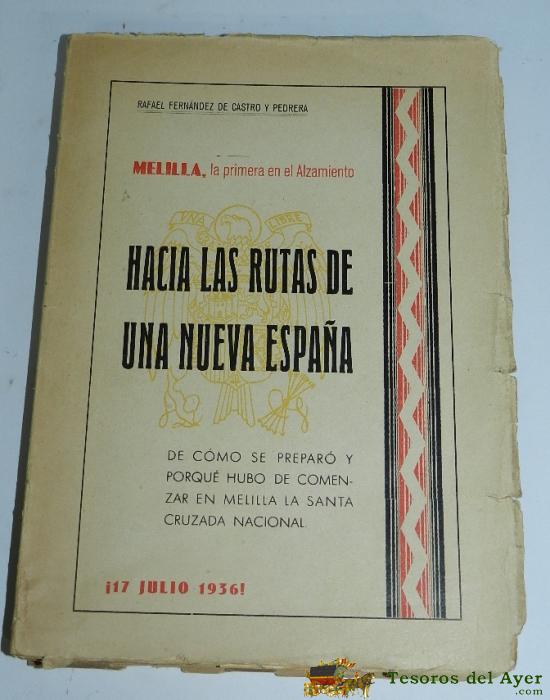 MELILLA, LA PRIMERA DEL ALZAMIENTO, HACIA LAS RUTAS DE UNA NUEVA ESPAñA,1940, DE RAFAEL FERNANDEZ DE CASTRO Y PEDRERA, 335 PAGINAS, MIDE 22 X 16 CMS. 17 DE JULIO DE 1936