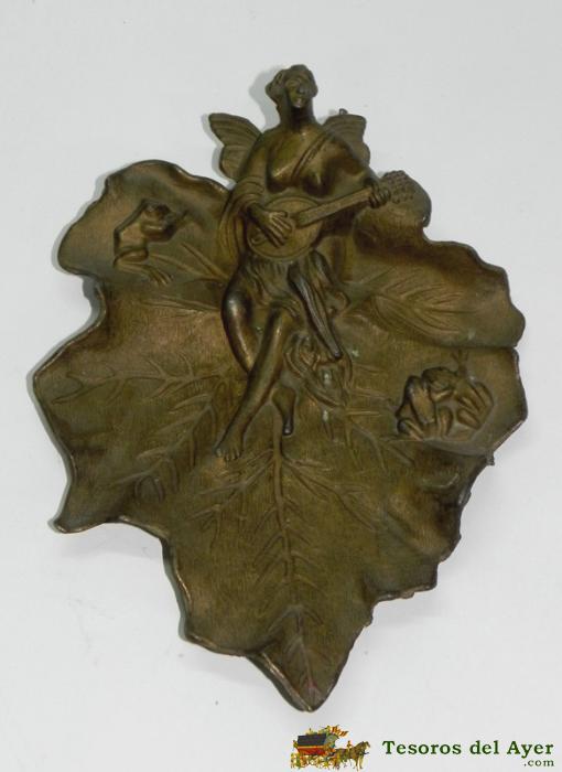 ANTIGUO Y PRECIOSA HOJA DE PARRA CON ANGEL Y RANAS, METALICA Y EL RELIEVE, PUDIERA SER UN CENICERO, MIDE 23 X 18 CMS.