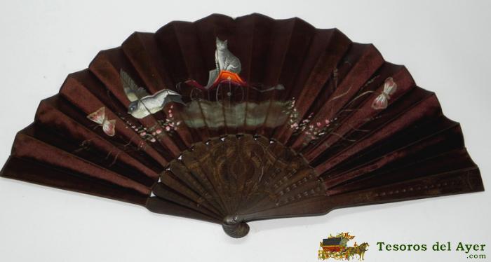 ABANICO DE MADERA Y TELA PINTADA, CON MOTIVO DE MARIPOSAS, PAJARO Y GATO PINTADOS, MIDEN LAS VARILLAS 27 CMS. DE LONGITUD, BUEN ESTADO.