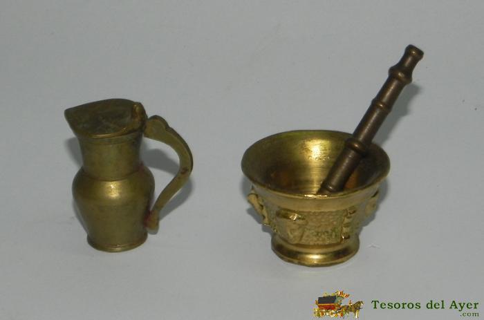 ALMIREZ O MORTERO DE BRONCE, JUNTO CON JARRA, EL MORTERO MIDE 3,5 CMS DE ALTO Y 4,5 CMS DE DIAMETRO.