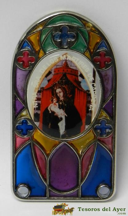 ANTIGUA PLACA VIDRIERA TRANSPARENTE DE NUESTRA SRA. DE LOS MARTIRES DE CARDEñA, MIDE 7,5 X 4 CMS.