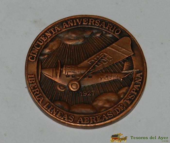MEDALLA DEL CINCUENTA ANIVERSARIO DE IBERIA LINEAS AEREAS ESPAÑOLAS, ALFONSO XIII 1927, JUAN CARLOS I 1977, MIDE 3,9 CMS. DE DIAMETRO, BRONCE