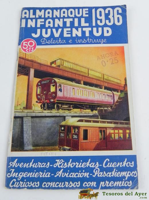 ALMANAQUE INFANTIL JUVENTUD 1936, MIDE 27,5 X 17 CM, TIENE 66 PAG. APROX. CONTENIDO TEXTO E ILUSTRACIONES EN BLANCO Y NEGRO, PUBLICADO POR EDITORIAL JUVENTUD – BARCELONA, MIDE 27,5 X 17 CMS. FALTA UNA ESQUINITA DE LA CONTRAPORTADA.