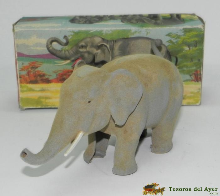 ANTIGUO ELEFANTE A CUERDA DE CH, JUGUETE Nº 304, MADE IN SPAIN, CON SU ESTUCHE ORIGINAL, EN BUEN ESTADO, AUNQUE LA CUERDA QUE SE DA EN LA COLA NO FUNCIONA. MIDE 18 X 8 X 6 CMS. CAJA 1.