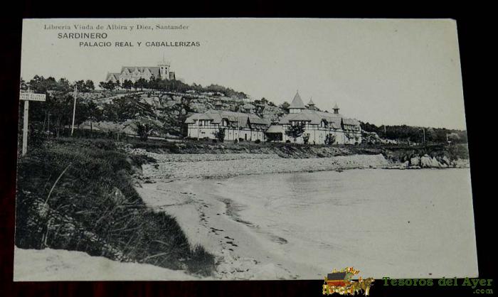 ANTIGUA POSTAL DE SANTANDER, SARDINERO, PALACIO REAL Y CABALLERIZAS, LIBRERIA VIUDA DE ALBIRA Y DIEZ, FOT. HAUSER Y MENET, NO CIRCULADA.