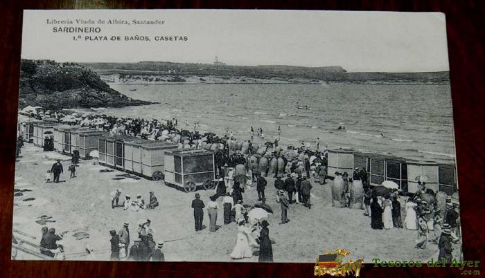 ANTIGUA POSTAL DE SANTANDER, 1º PLAYA DE BAÑOS, CASETAS, LIBRERIA VIUDA DE ALBIRA Y DIEZ, FOT. HAUSER Y MENET, NO CIRCULADA.