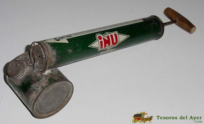 ANTIGUO FUMIGADOR DE HOJALATA LITOGRAFIADA CON PUBLICIDAD DE INU, EMULSION D.D.T. LIQUIDO PARA MEZCLAR CON AGUA, MIDE 34 CMS DE LARGO. -- C3.