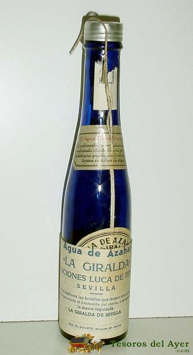ANTIGUA BOTELLA CON PUBLICIDAD DE AGUA DE AZAHAR, LA GIRALDA, DESTILACIONES LUCA DE TENA, SEVILLA, MIDE 23,6 CMS. DE ALTURA. AÑOS 20- 30 ---C3--