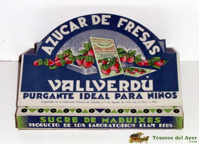 ANTIGUA CAJA DE CARTON LITOGRAFIADO CON PUBLICIDAD DE FARMACIA, VALLVERDU PURGANTE IDEAL PARA NIÑOS, AZUCAR DE FRESAS, MONTADA MIDE 26,5 X 19 X 3 CMS. TAL COMO SE VE EN LA FOTO.