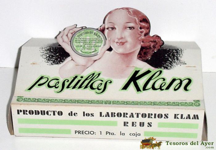 ANTIGUA CAJA DE CARTON CON PUBLICIDAD DE FARMACIA - PASTILLAS KLAM - MIDE 25,5 X 17 X 5,5 CMS. TAL COMO SE VE EN LA FOTO.