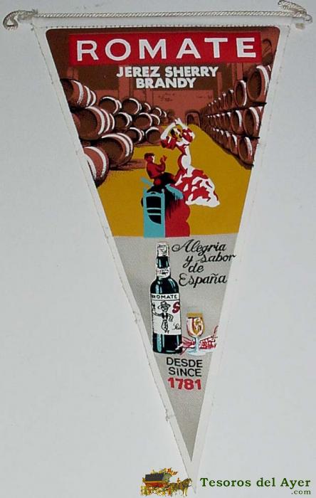 ANTIGUO BANDERíN CON PUBLICIDAD DE JEREZ Y BRANDY ROMATE. MIDE 27,5 CM.