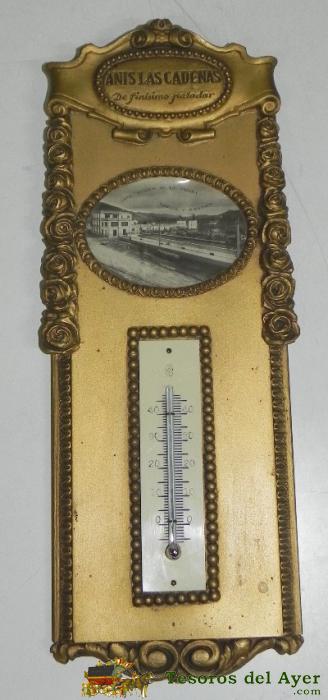 ANTIGUO TERMOMETRO CON PUBLICIDAD DE ANIS LAS CADENAS, DE FINISIMOS PALADAR, CON IMAGEN DE LA VISTA GENERAL DE LA FABRICA, BODEGAS Y ALMACENES, HIJOS DE A. ESPARZA, EN VILLAVA, NAVARRA, ATARRABIA, NAFARROA, MIDE 32 X 12 CMS.