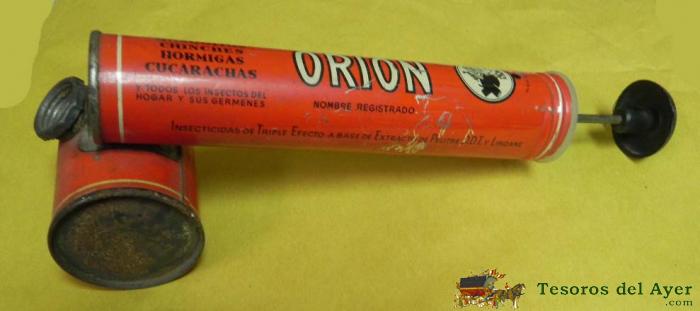 ANTIGUO FUMIGADOR DE HOJALATA LITOGRAFIADA, CON PUBLICIDAD DE ORION INSECTICIDA, MIDE 26 CMS DE LARGO. -- C7.