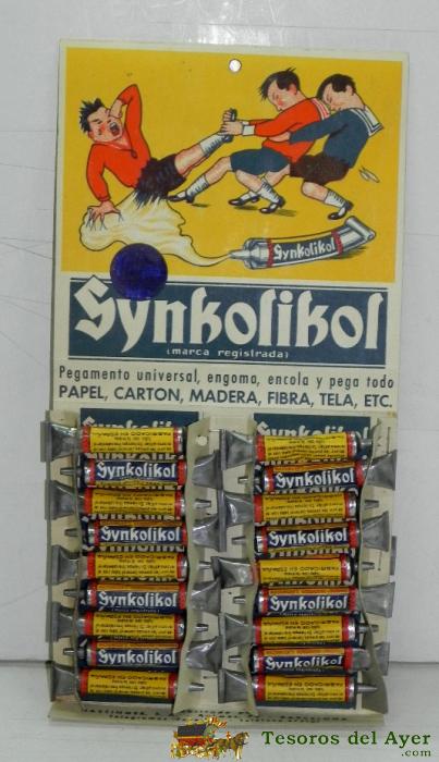 DISPENSADOR PEGAMENTO SYNKOLIKOL, BARCELONA, AñOS 50. DISPLAY-DISPENSADOR DEL PRODUCTO SYNKOLIKOL, DE LOS AñOS 50. MIDE 36 X 16 CM. , TIENE 18 TUBOS DE PEGAMENTO, PEGAMENTO UNIVERSAL, ENGOMA, ENCOLA Y PEGA TODO. PAPEL, CARTON, MADERA, FIBRA, TELA, ETC. MI