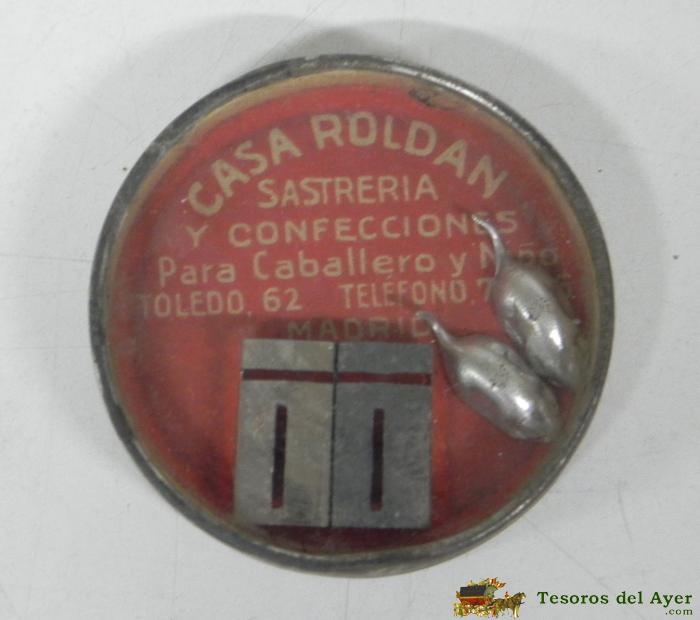 ANTIGUO JUEGO DE HABILIDAD CON PUBLICIDAD DE CASA ROLDAN, SASTRERIA Y CONFECCIONES, EN EL REVERSO TIENE UN ESPEJO, MIDE 4,5 CMS.