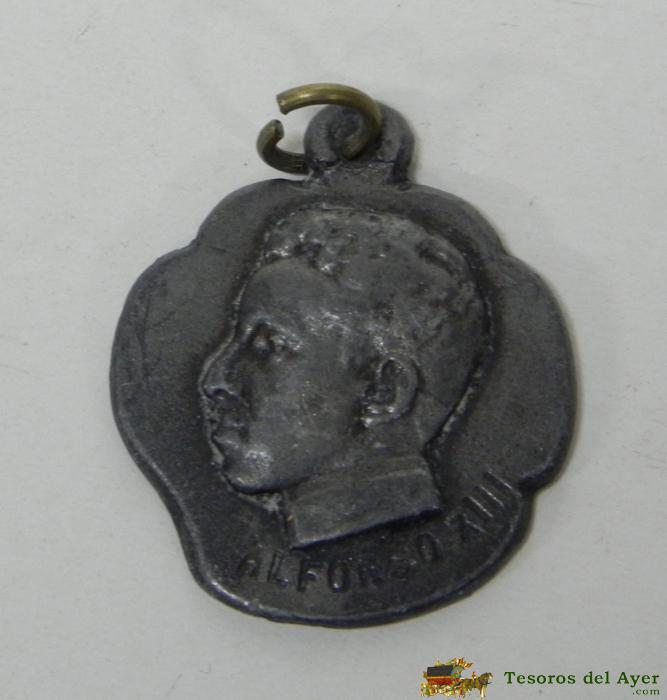ANTGUA MEDALLITA ALFONSO XIII CON PUBLICIDAD DE ALFOMBRAS TAPICES Y LINOLEUM, CALLE CARMEN 22 Y 24 DE MADRID, MIDE 2,9 X 2,5 CMS.