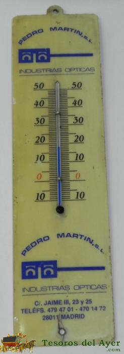 ANTIGUO TERMOMETRO DE PUBLICIDAD DE LAS INDUSTRIAS OPTICAS PEDRO MARTIN, MADRID, MIDE 27 X 7 CMS.