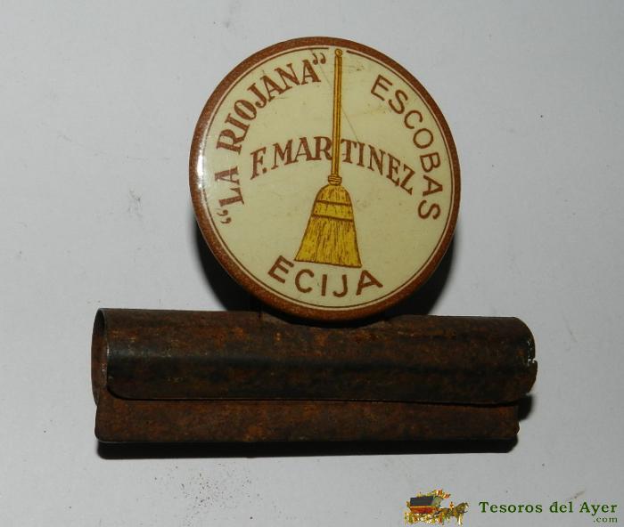 ANTIGUA PINZA DE HOJALATA LITOGRAFIADA CON PUBLICIDAD DE LA RIOJANA, ESCOBAS, F. MARTINEZ DE ECIJA (SEVILLA), MIDE 6,5 X 6 CMS. BUEN ESTADO DE CONSERVACION. MUY RARA.