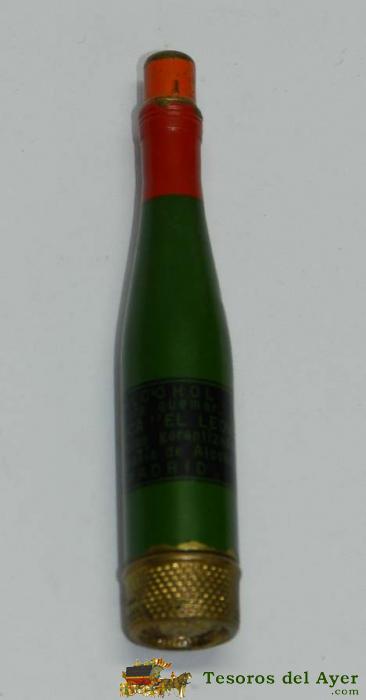 BOTELLITA MINIATURA CON PUBLICIDAD DE ALCOHOL PARA QUEMAR MARCA EL LEON, DENTRO LLEVA UN LAPICERO, AGUJA E HILO, MIDE LA BOTELLA 9 CMS. DE ALTURA.