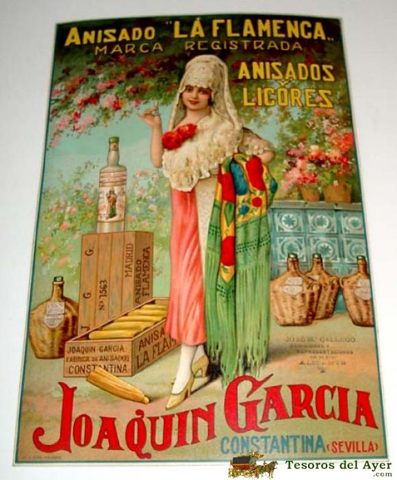 ANTIGUO CARTEL DE PUBLICIDAD PERTENECIENTE AL REPRESENTANTE JOSE MARIA GALLEGO COMISIONES Y REPRESENTACIONES - ALICANTE - ANISADO LA FLAMENCA - ANISADOS Y LICORES - JOAQUIN GARCIA - CONSTANTINA - SEVILLA - MUY BUEN ESTADO DE CONSERVACION - 40 CMS X 27 CM
