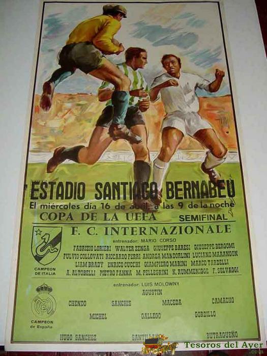 ANTIGUO CARTEL DE LA COPA DE LA UEFA SEMIFINAL ENTRE EL - REAL MADRID Y EL F.C. INTERNAZIONALE - FUTBOL AÑOS 80 EN EL ESTADIO SANTIAGO BERNABEU MADRID - LIT. ORTEGA DE VALENCIA DEPOSITO LEGAL 1963. CARTEL ORIGINAL - MIDE 100 X 55 CMS. APROX. JUGARON EL DI