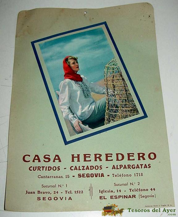 ANTIGUO CARTELITO DE CARTULINA CON PUBLICIDAD DE CASA HEREDERO, CURTIDOS, CALZADOS, ALPARGATAS . SEGOVIA Y EL ESPINAR (SEGOVIA) - MIDE 34 X 24 CMS.