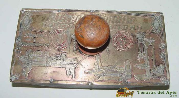 ANBTIGUO SECANTE DE MANO DE LATON Y MADERA, CON PUBLICIDAD DE ALFRED M. SCHUTTE, MAQUINAS Y HERRAMIENTAS, BARCELONA, BILBAO - MIDE 15 X 8 X 6,5 CMS. TAL COMO SE VE EN LAS FOTOS