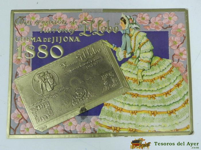 ANTIGUO CARTEL PUBLICIDAD TURRONES EL LOBO, CARTON CON RELIEVE, CREMA DE JIJONA 1880, ALICANTE, MIDE 34 X 24 CMS.