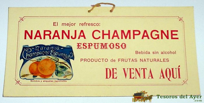 ANTIGUO CARTEL DE CARTON CON PUBLICIDAD DE EL MEJOR REFRESCO: NARANJA CHAMPAGNE ESPUMOSO. DE VENTA AQUÍ. AÑOS 20/30. MEDIDAS 32,5 X 16 CM.