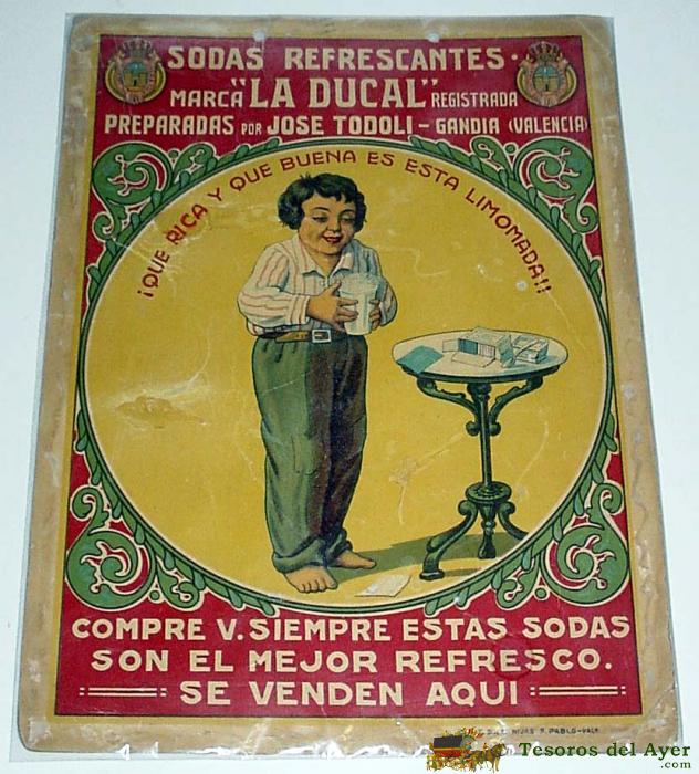 ANTIGUO CARTEL DE PUBLICIDAD DE SODAS REFRESCANTES LA DUCAL, PREPARADOS POR JOSE TODOLI, GANDIA VALENCIA, FARMACIA. LIT. SUC. HIJAS S. PABLO. EN CARTON, MIDE 35 X 25 CMS.