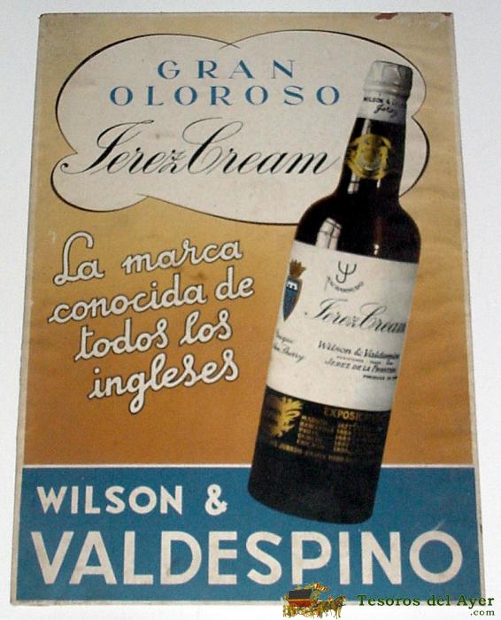 ANTIGUO DISPLAY PUBLICITARIO DE PIE. WILSON & VALDESPINO. GRAN OLOROSO. JEREZ CREAM. MEDIDAS 32.5 X 22.5CM. PARA COLOCARLO DE PIE, LLEVA EN LA PARTE TRASERA EL SOSTENEDOR DE CARTON. BODEGA, VINO