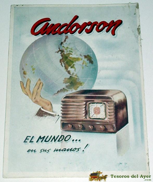 ANTIGUO CARTEL DE PUBLICIDAD DE RADIOS ANDORSON, RADIO, EL MUNDO EN TUS MANOS, MIDE 30 X 22,5 CMS.