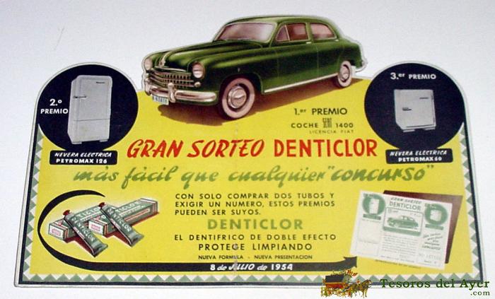 ANTIGUO DISPLAY PUBLICITARIO DE PIE. GRAN SORTEO DENTICLOR (SEAT 1400) 1954, MIDE 36 X 24,5 CM. PARA COLOCARLO DE PIE, LLEVA EN LA PARTE TRASERA EL SOSTENEDOR DE CARTON. DENTIFRICO