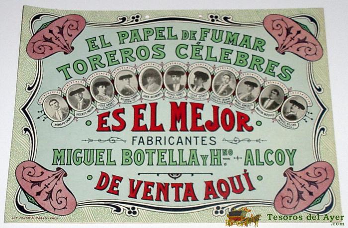 ANTIGUO CARTEL DE PUBLICIDAD DE PAPEL DE FUMAR TOREROS CELEBRES, MIGUEL BOTELLA Y HNO. ALCOY, LIT. HIJAS S. PABLO, JUAN BELMONTE, RAFAEL GOMEZ (GALLO), GALLITO III, MACHAQUITO, BOMBITA, ETC... MIDE 32 X 24,5 CMS.