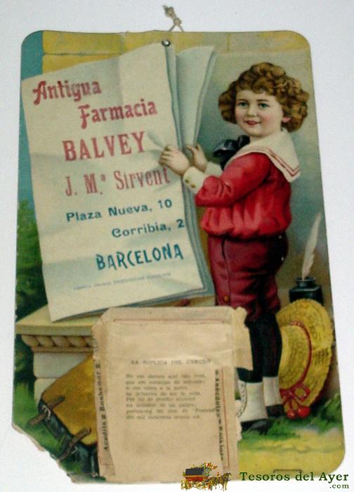 ANTIGUO CROMO DE CARTON CON PUBLICIDAD DE FARMACIA BALVEY, J.M. SIRVENT, BARCELONA, FABRICA CROMOS FRIEDRICHS, MIDE 29 X 18 CMS.