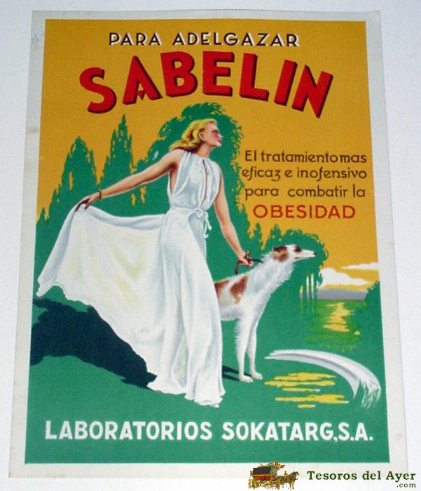 ANTIGUO DISPLAY DE CARTON CON PUBLICIDAD DE SABELON, TRATAMIENTO PARA LA OBESIDAD, LABORATORIOS SOKATARG, MIDE 29 X 22 CMS.