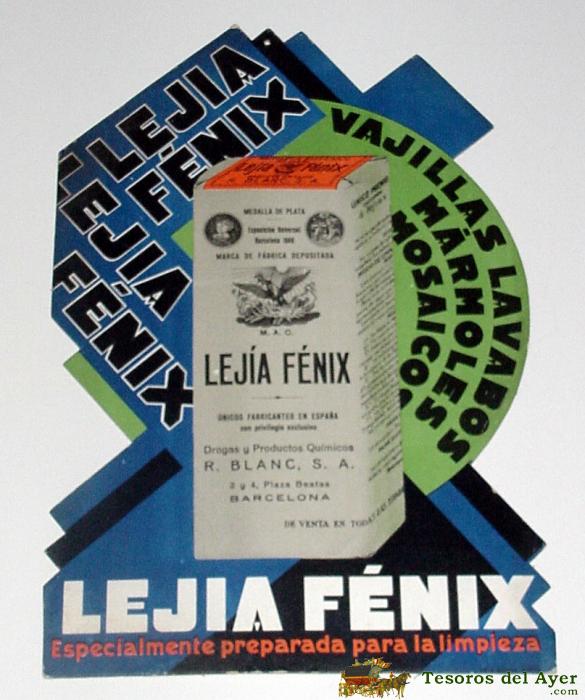 ANTIGUA DISPLAY DE CARTON CON PUBLICIDAD DE LEJIA FENIX, DROGAS Y PRODUCTOS QUIMICOS R. BLANC, BARCELONA - MIDE 30 X 21 CMS.