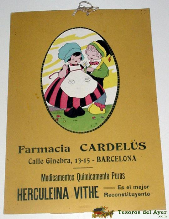 ANTIGUO CARTELITO DE CARTON PARA COLGAR CON PUBLICIDAD DEFARMACIA CARDELUS, CALLE GINEBRA 13-15 DE BARCELONA, MEDICAMENTOS QUIMICAMENTE PUROS, HERCULEINA VITHE, MIDE 36,5 X 25 CMS.