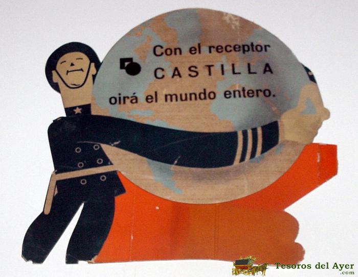 ANTIGUA DISPLAY DE CARTON CON PUBLICIDAD, CON EL RECEPTOR CASTILLA OIRA EL MUNDO ENTERO - RADIO, MIDE 26 X 24 CMS.