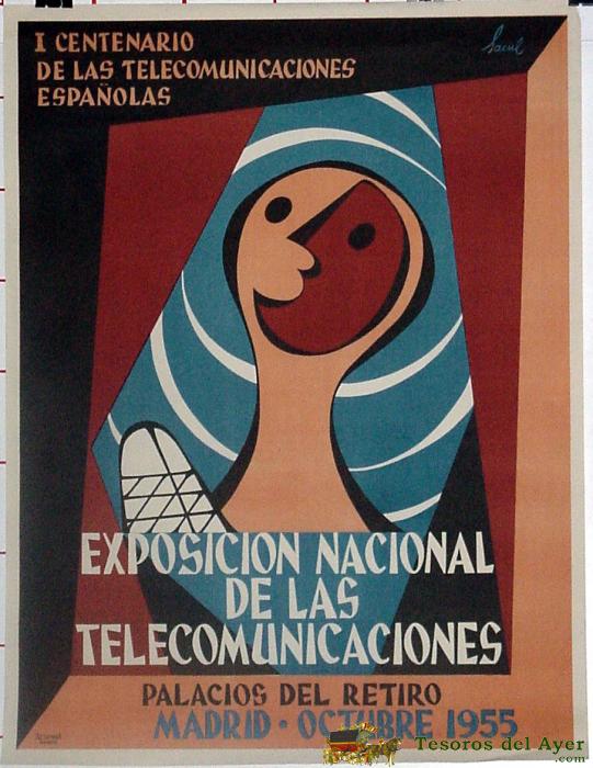 ANTIGUO CARTEL ORIGINAL Y ANTIGUO DE MADRID EXPOSICION NACIONAL DE LAS TELECOMUNICACIONES, I CENTENARIO DE LAS TELECOMUNICACIONES ESPAÑOLAS, PALACIOS DEL RETIRO, OCTUBRE 1955 - MIDE 64 X 84 CMS.