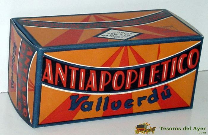 ANTIGUA CAJA DE CARTON LITOGRAFIADO CON PUBLICIDAD DE FARMACIA, VALLVERDU ANTIAPOPLETICO, MONTADA MIDE 16,2 X 7,5 X 7,5 CMS. TAL COMO SE VE EN LA FOTO. CAJA 7