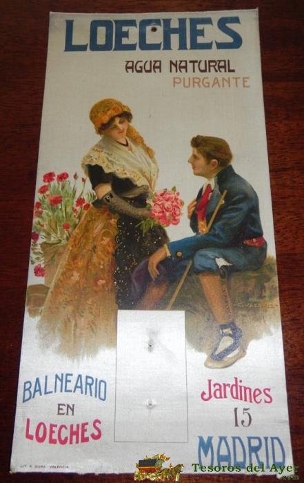 ANTIGUO CARTEL CON PUBLICIDAD DE LOECHES CATALANES REALIZADO EN SEDA PAREJA DE CATALUÑA, A FINALES DEL XIX O PRINCIPIOS DEL XX, FARMACIA. AGUA MINERAL NATURAL PURGANTE, BALNEARIO EN LOECHES, ILUSTRADOR CARLOS VAZQUEZ - JARDINES 15 MADRID - EXCELENTE ESTAD