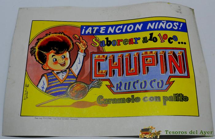 CARTEL PUBLICITARIO DE GHUPIN ROCOCO, CARAMELO CON PALITO - ILUSTRACION DE BROTONS - IND. GRAFICAS GOMEZ, TARANCON 1966 - MIDE 36 X 26 CMS.