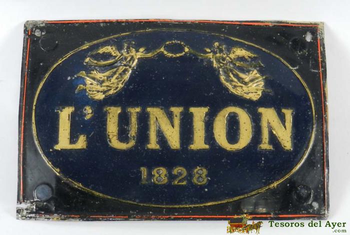 ANTIGUA CHAPA DE SEGUROS LUNION 1828, EN RELIEVE, MIDE 26,5 X 17,5 CMS.