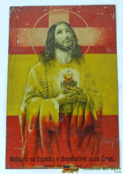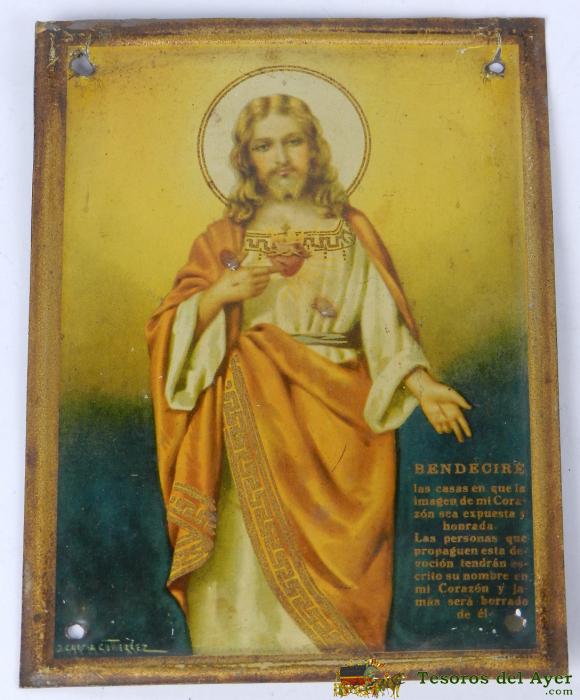 ANTIGUA CHAPA DE HOJALATA LITOGRAFIADA DE EL SAGRADO CORAZON DE JESUS - MIDE 15 X 9,5 CMS. SE PONIAN EN LA PUERTA DE LAS CASAS A FIN DE BENDECIRLAS DESPUES DE LA GUERRA CIVIL, CENTRO EDITOR VIGO.