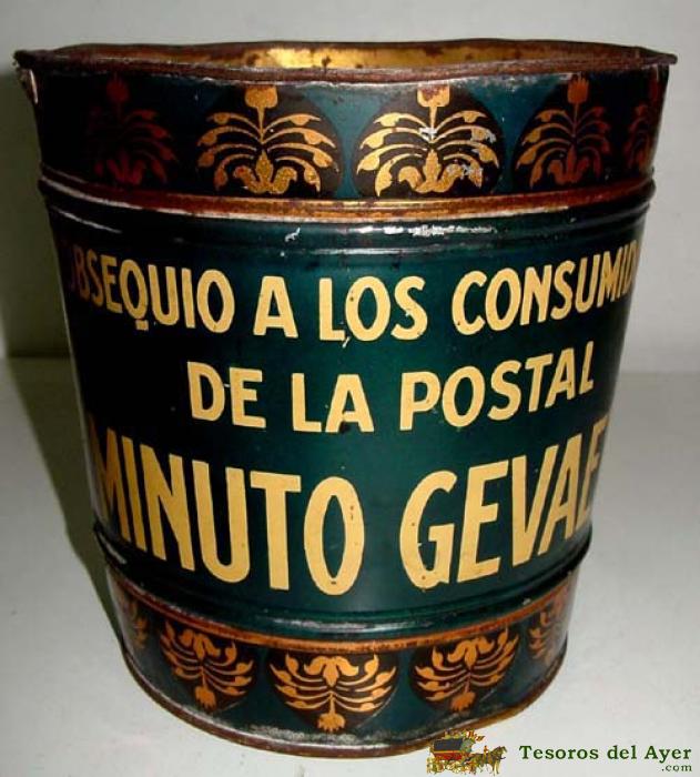 ANTIGUO CUBO DE HOJALATA LITOGRAFIADA CON PUBLICIDAD DE OBSEQUIO A LOS CONSUMIDORES DE LA POSTAL MINUTO GEVAERT - MIDE 20 CMS. DE ALTURA Y 19 CMS. DE DIAMETRO . TIN