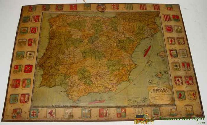 ANTIGUA CHAPA DE HOJALATA LITOGRAFIADA CON PUBLICIDAD DE SERVUS Y KAOL - MAPA DE ESPAÑA - MIDE 67X49 CMS.